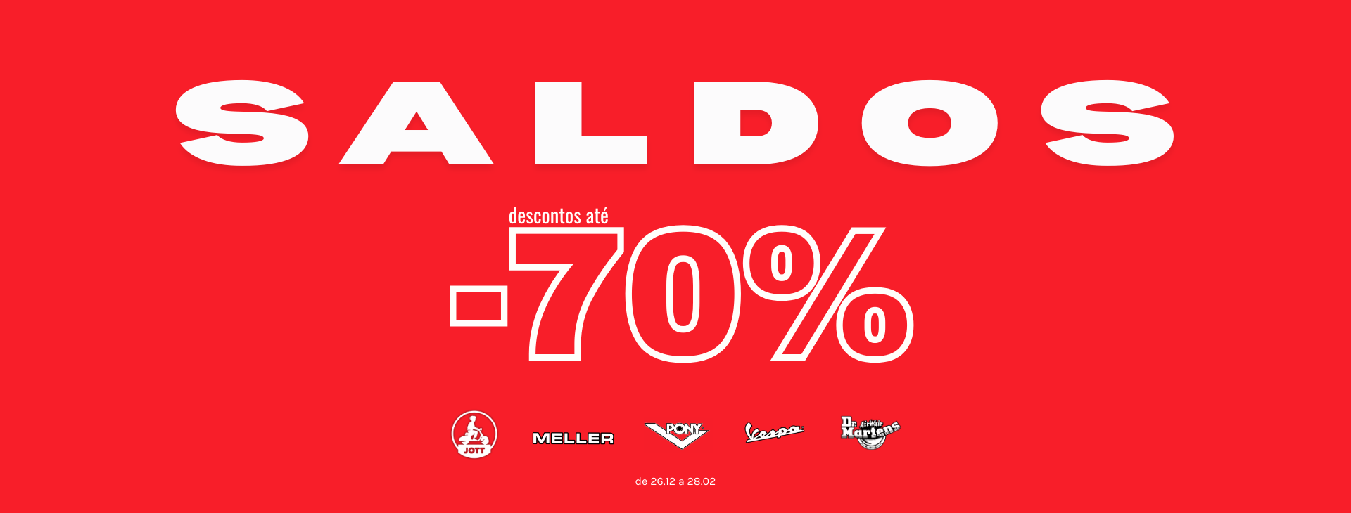 Na nossa loja física poderás encontrar produtos da Carhartt, Dr. Martens, JOTT, Vespa, Pony, Hey Dude e Openspace, bem como uma seleção de produtos da Fred Perry com descontos.